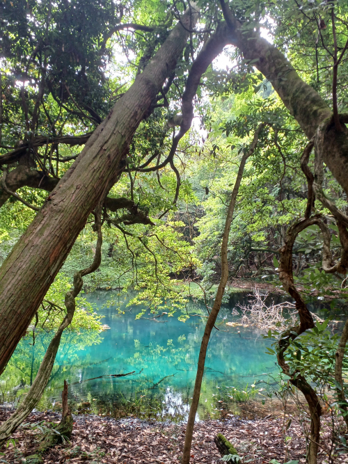 幻想的なエメラルドグリーンの水の色はとても澄んでおり、魚が泳いでいてまるでモネの池のようでした。