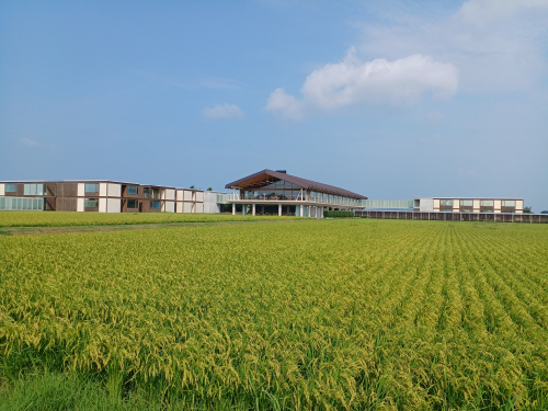 田んぼに浮かぶホテルで、稲穂が実っていて