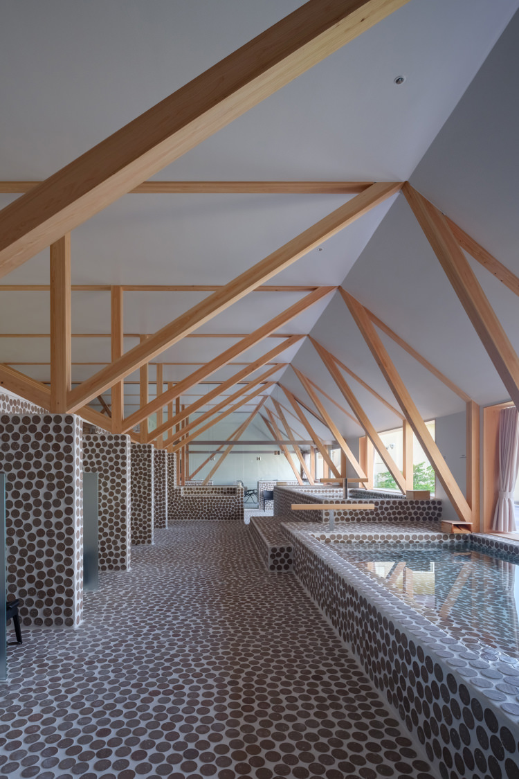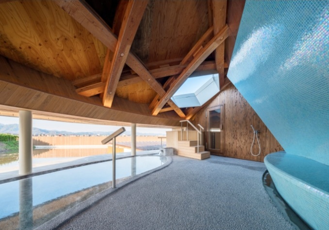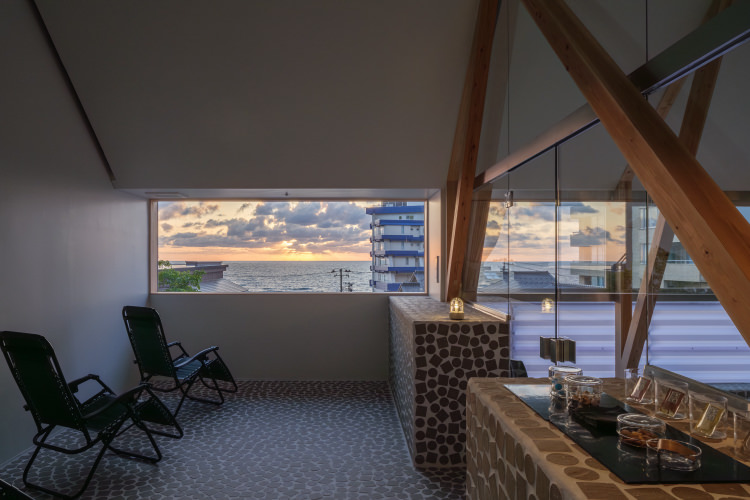 奥にある水風呂の天井は六角形に穴が空いておりそこからは空が見え、夜には星が見えます。